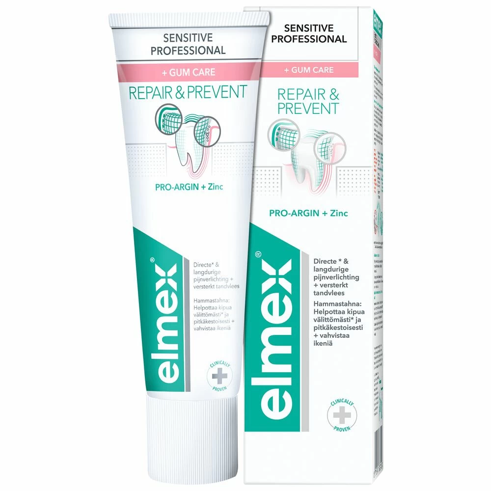 Elmex Sensitive Professional Repair & Prevent Tandpasta 75 mlEen exclusieve formule die is gebaseerd op de klinisch bewezen PRO-ARGIN® technologie die tandartsen hun patiënten adviseren om de pijn van gevoelige tanden te verzachten. Herstelt gevoelige gebieden van de tand direct en langdurig. Het ingredient zink voorkomt verdere gevoeligheid.