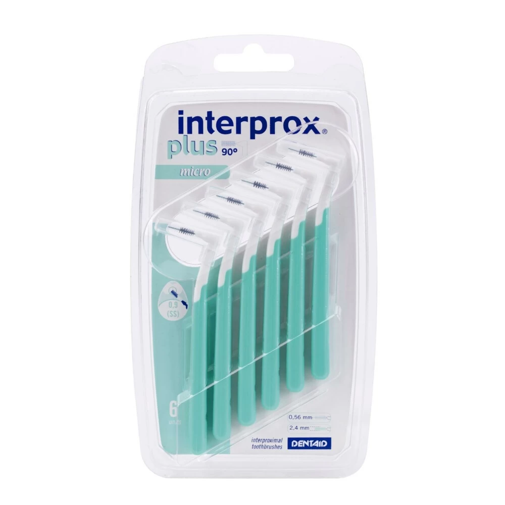 Interprox Plus Micro 2.4 mm Groen 6 stuksDe Interprox Plus Micro 2.4 mm is specifiek voor het reinigen van de ruimten tussen de kiezen wat verder achter in de mond ter hoogte van de wang. Het rager gedeelte staat onder een hoek van 90 graden, waardoor de ruimtes tussen de kiezen achter in de mond makkelijker bereikbaar worden. Hierdoor is het ombuigen van het borstel gedeelte niet meer nodig. De rager bevat 2 verschillende kleuren borstelharen, op de zwarte haren is het tandplaque wat verwijderd