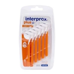 Interprox Plus Super Micro 2 mm Oranje 6 stuksDe Interprox Plus Super Micro 2.0 mm is specifiek voor het reinigen van de ruimten tussen de kiezen wat verder achter in de mond ter hoogte van de wang. Het rager gedeelte staat onder een hoek van 90 graden, waardoor de ruimtes tussen de kiezen achter in de mond makkelijker bereikbaar worden. Hierdoor is het ombuigen van het borstel gedeelte niet meer nodig. De rager bevat 2 verschillende kleuren borstelharen, op de zwarte haren is het tandplaque wat