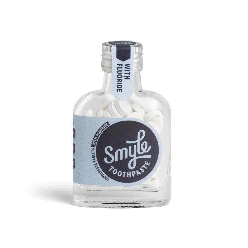 Smyle Tandpasta Tabletten Met Fluoride StartpakketDe Smyle Tandpasta Tablet Met Fluoride Startpakket zijn duurzame tandpasta tabletten gemaakt van natuurlijke ingrediënten in een milieuvriendelijke flesverpakking. Alle producten van Smyle zijn geheel plasticvrij. Je kan deze fles makkelijk navullen met de navulverpakking van Smyle. De tabletten bestaan uit eucalyptus, aloë era en calcium carbonate, zijn heel makkelijk te gebruiken en het zorgt voor heerlijke frisse tanden!Duurzame tand