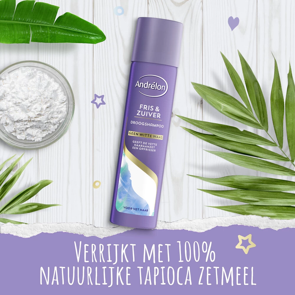 Andrélon Special Droogshampoo Fris & Zuiver 245 mlAndrélon Fris & Zuiver Droogshampoo heeft een actieve formule tegen vet haar en zorgt dat onzuiverheden worden verwijderd en je haar meer textuur krijgt.Andrélon Special Fris & Zuiver Droogshampoo neemt vet op bij de haaraanzetDe droogshampoo is verrijkt met 100% natuurlijk tapiocazetmeelGeeft je haar een verfrissende boost zonder een witte waas achter te latenGeeft vet haar een krachtige verfrissing tussen de was