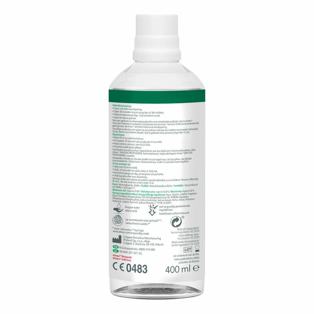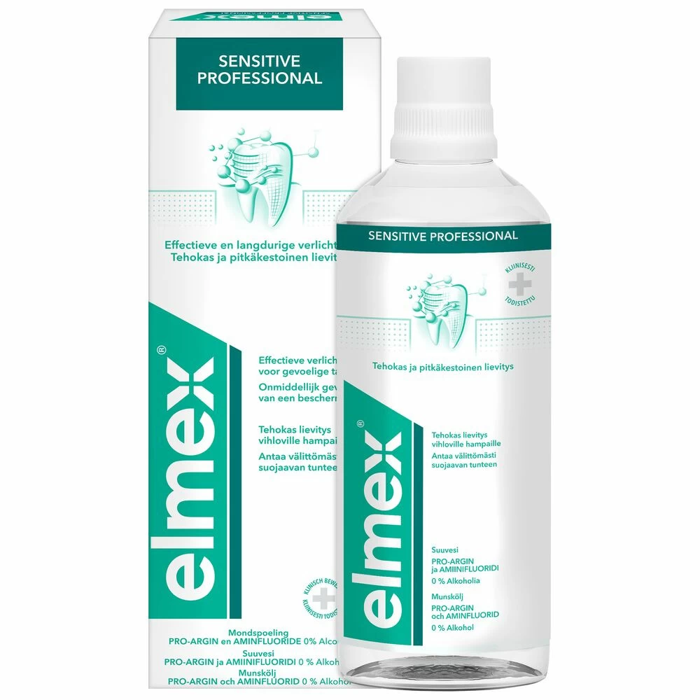 Elmex Tandspoeling Sensitive ProfessionalDe PRO-ARGIN™ formule in elmex Sensitive Professional tandspoeling zorgt voor directe en langdurige verlichting bij gevoelige tanden.Het sluit de kanaaltjes die naar de gevoelige tandzenuw leiden af, zodat de pijn wordt tegengehouden. De tandspoeling bevat een speciale samenstelling voor een onmiddellijk gevoel van een beschermende laag en Aminfluoride voor de effectieve bescherming tegen gaatjes. Milde mintsmaak en bevat geen alcohol.