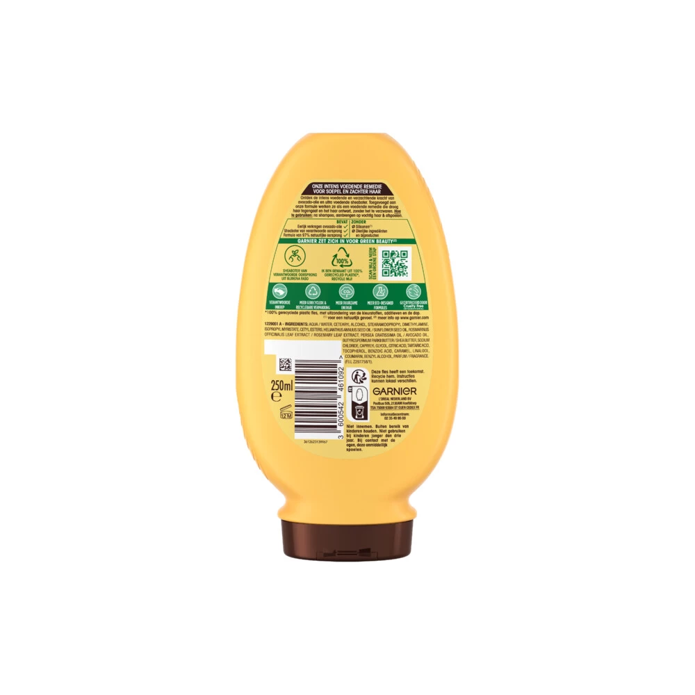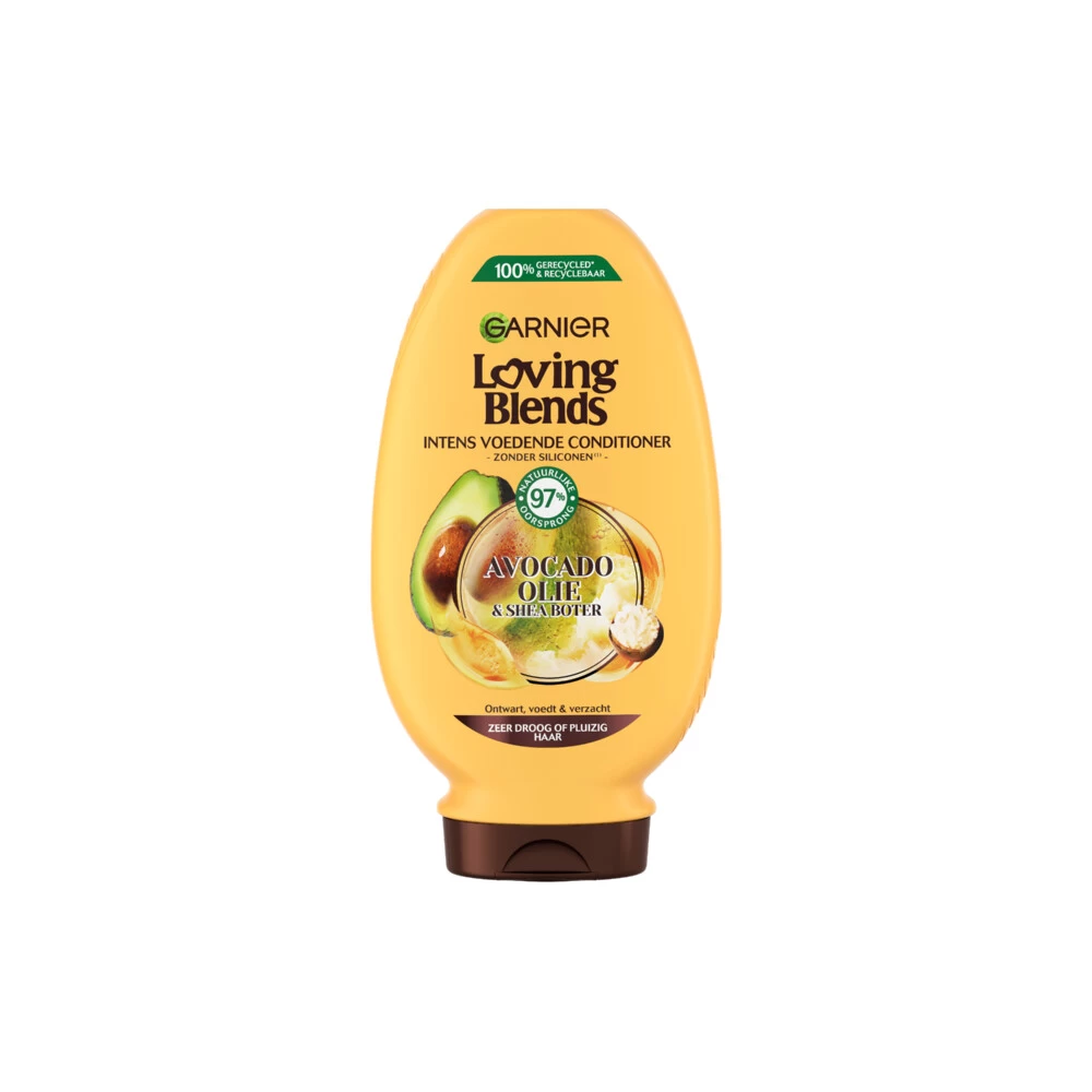 Garnier Loving Blends Avocado Olie & Shea Boter ConditionerLoving Blends Avocado Olie & Shea boter Conditioner is een intens voedende conditioner van 97% natuurlijke oorsprong die zeer droog of pluizig haar ontwart, voedt en verzacht. Speciaal voor zeer droog haar tot pluizig haar heeft Garnier Loving Blends een formule samengesteld met avocado olie en karitéboter: het haar wordt soepel en gevoed van de haaraanzet tot in de punten, en is makkelijk in model te brengen. Geniet v