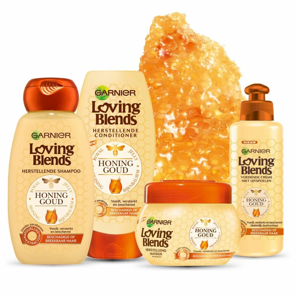 Garnier Loving Blends Honinggoud Leave-in Crème – 200 ml Speciaal voor beschadigd en breekbaar haar combineert Garnier Loving Blends drie schatten uit de honinggraad: Royal Jelly, Bijenbalsem en Honing. Deze crème heeft een direct verzorgende werking en omhult je haar met een heerlijke honing geur. Het resultaat:Een betere verzorging, bescherming en herstellende werking tot in de punten. Je haar is makkelijk in model te brengen, voel intens zacht aan en heeft een stralende glans.Hoe te gebruik