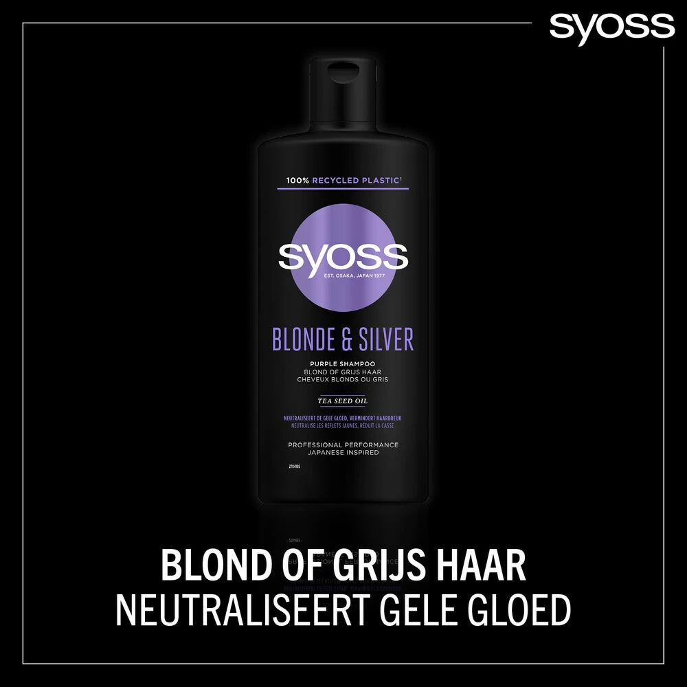 Syoss Blonde and Silver Shampoo 440 mlDeze shampoo neutraliseert de gele gloed uit blond, gehighlight en grijs haar, vermindert haarbreuk en herstelt gebroken haarbruggen. De formule beschermt het haar tegen vervaging en verkleuring.De shampoo neutraliseert de gele gloed uit blond en grijs haar, vermindert haarbreuk en herstelt gebroken haarbruggen.De shampoo is speciaal ontwikkeld voor blond of grijs haar.De formule bevat een mix van aminozuren, de bouwstenen van het haar die bijdragen aan gezo