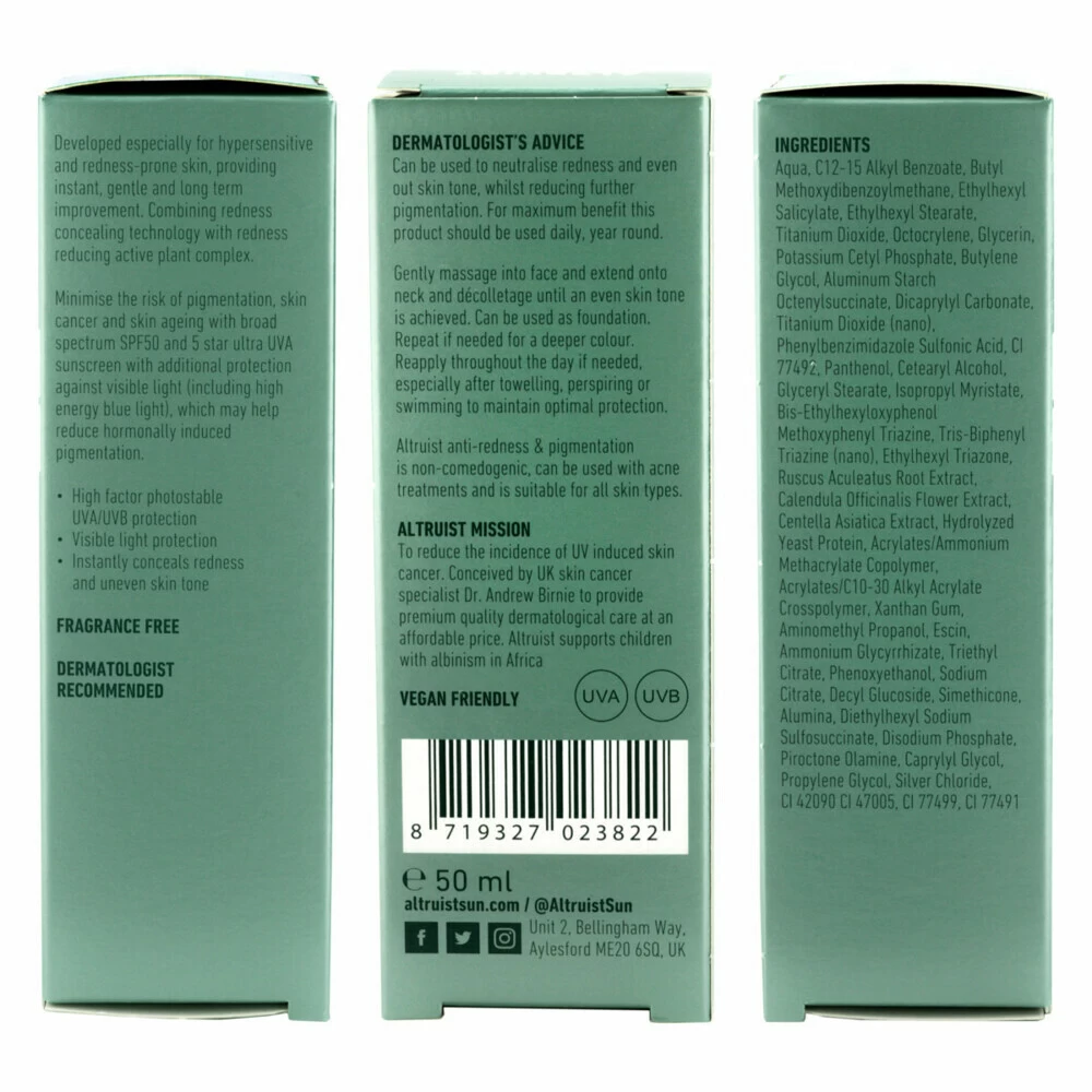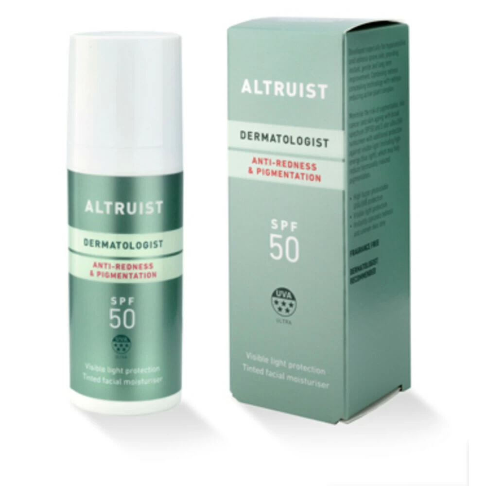 Altruist Zonnebrand Anti-Roodheid en Pigment 50 mlHet team achter Altruist zonnebrand heeft een nieuwe anti-roodheid en pigmentatie moisturizer en getinte dagcrème op de markt gebracht.Camoufleert roodheidEgaliseert huidpigmentatieBevat kalmerende ingrediëntenBehandelt de gevoelige huidGeschikt voor mensen met rosaceaAltruist anti-roodheid en pigment zonnebrand is speciaal ontwikkeld voor de overgevoelige huid. Het product camoufleert roodheid en biedt bescherming tegen zichtbaar lic