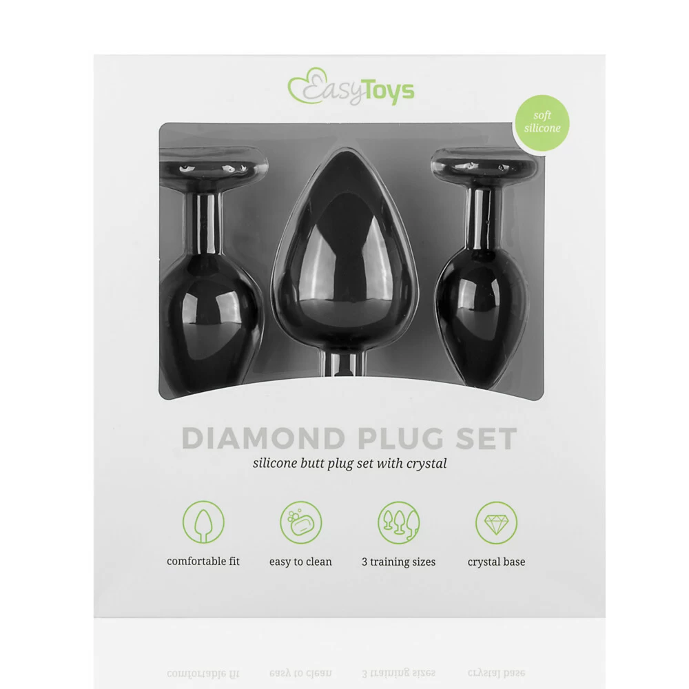 EasyToys Luxe Buttplug Set – ZwartDeze 3-delige buttplug set is perfect voor iedereen die anale stimulatie wil ontdekken. De buttplugs hebben verschillende afmetingen, zodat je klein kan beginnen en in je eigen tempo steeds een stapje verder kunt gaan. De plugs zijn gemaakt van heerlijk zacht, lichaamsveilig siliconen voor een comfortabel gebruik. De platte onderkant van de plugs zorgt voor een veilig gebruik. Ook is de onderkant voorzien van een schitterende steen, wat de plugs een luxe uitstra