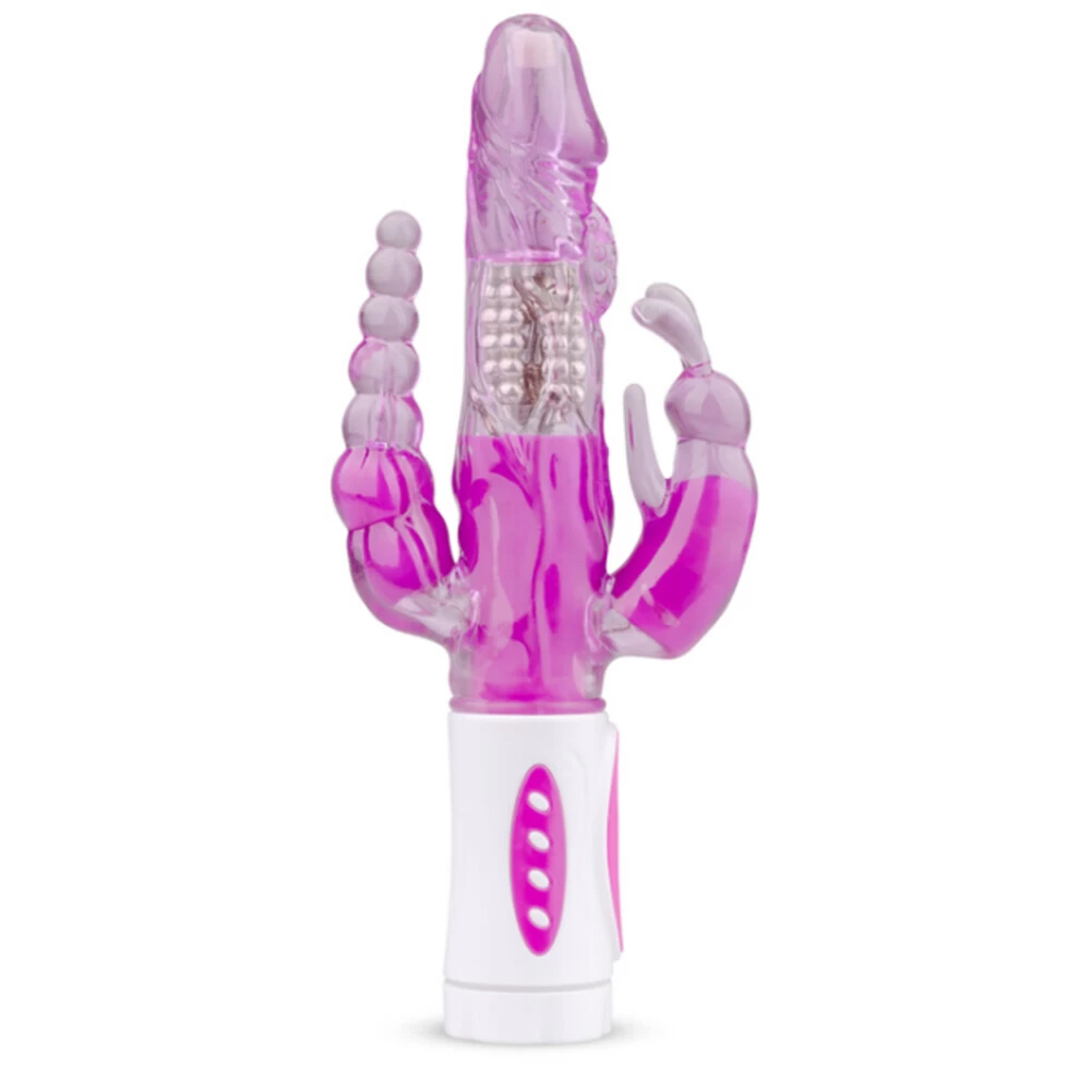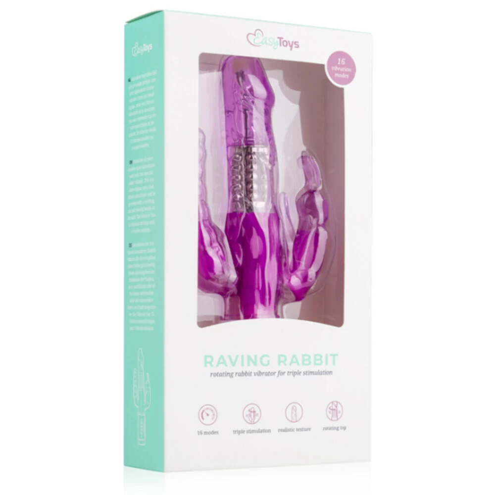 Easytoys Driedubbele Raving Rabbit VibratorDe tarzan vibrator en rabbit vibrator zoals iedereen hem kent! Dit populaire model stimuleert tegelijkertijd de clitoris, G-spot en anus. De roterende kralen in de realistisch gevormde schacht geven een inwendige massage en zorgen samen met de roterende kop voor een intense G-spot stimulatie. De flexibele clitorisstimulator is voorzien van oortjes die de clitoris raken tijdens gebruik.Stimuleert tegelijkertijd de clitoris, G-spot en anusGeeft een inwend