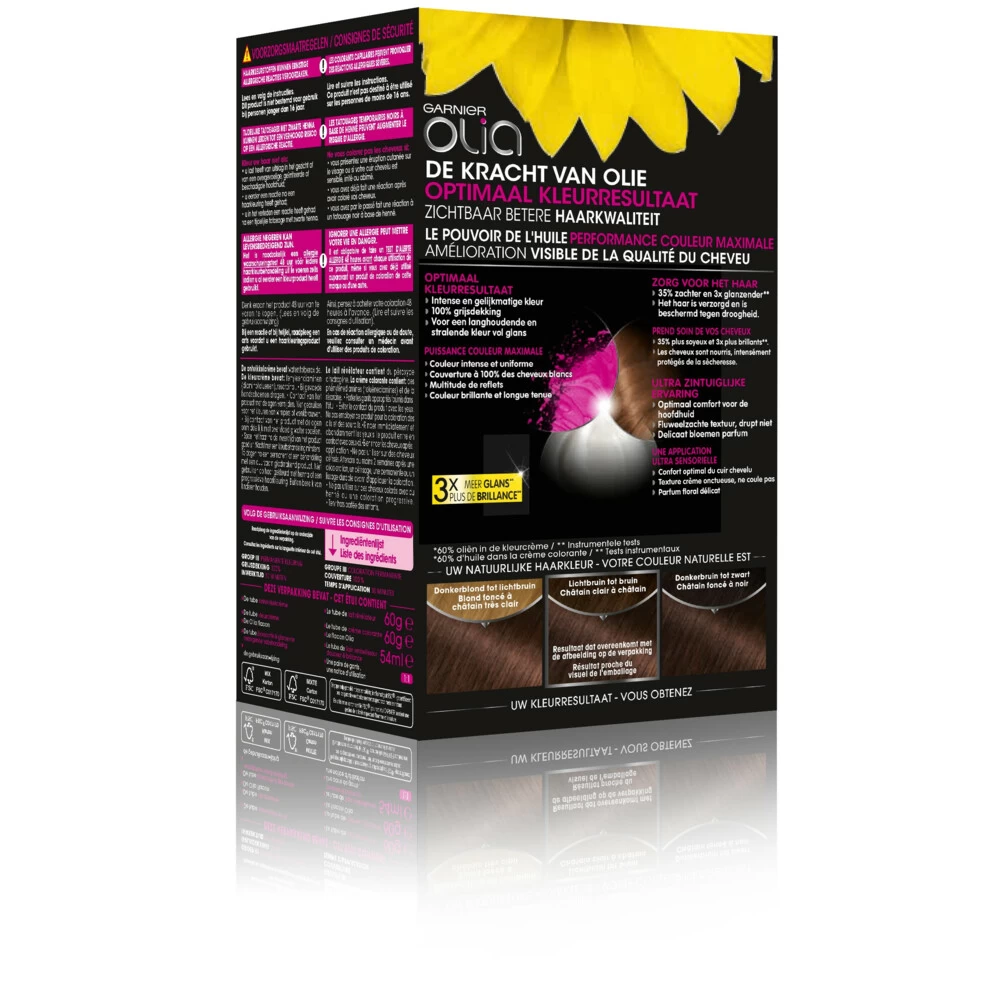 Garnier Olia haarverf 4.8 – Mokka BruinGarnier Olia permanente crèmekleuring geeft 100% grijsdekking en is op basis van 60% oliën. De haarverf geeft jouw haar een intense kleur en zorgt voor een zichtbaar betere haarkwaliteit. De permanente thuiskleuring bevat geen ammoniak wat voor een aangename geur zorgt. De thuiskleuring zorgt voor optimaal comfort voor je hoofdhuid.Garnier Olia beschermd tegen droogheid en maakt je haar 35% zachter. De haarverf is fluweelzacht van textuur, drupt