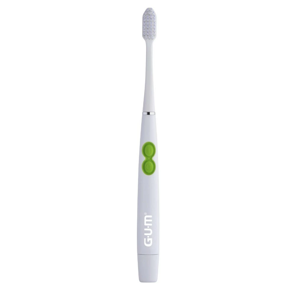 GUM Elektrische Tandenborstel Sonic Daily WitDe GUM ActiVital White Elektrische tandenborstel is een sonische tandenbostel die op batterijen werkt. Deze witte tandenborstel maakt door middel van 12.000 bewegingen per minuut op milde wijze de tanden en kiezen schoon. De trilkracht zorgt voor een betere reiniging dan een normale handtandenborstel. De borstelharen zijn taps toelopend en zijn daar door 50% effectiever in het bereiken van de ruimtes tussen de tanden en kiezen. Er word die