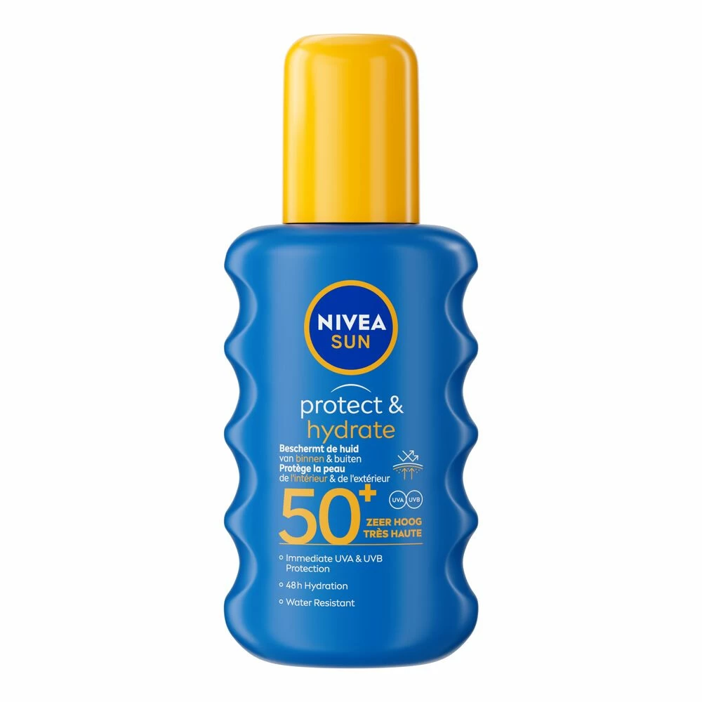 Nivea Sun Protect & Hydrate Hydraterende Zonnespray SPF 50Nivea Sun Protect & Hydrate Spray SPF50+ 200ml beschermt de gezonde huid van binnen & buiten. Het biedt onmiddellijke UVA/UVB-bescherming en ondersteunt de huidbescherming van binnenuit met anti-oxidatieve vitamine E. De huid blijft 48 uur lang gehydrateerd. De waterbestendige formule is voor 88% biologisch afbreekbaar* en respecteert de oceaan door vrij te zijn van UV-filters Octinoxate, Oxybenzone en Octocrylene. De verpakki