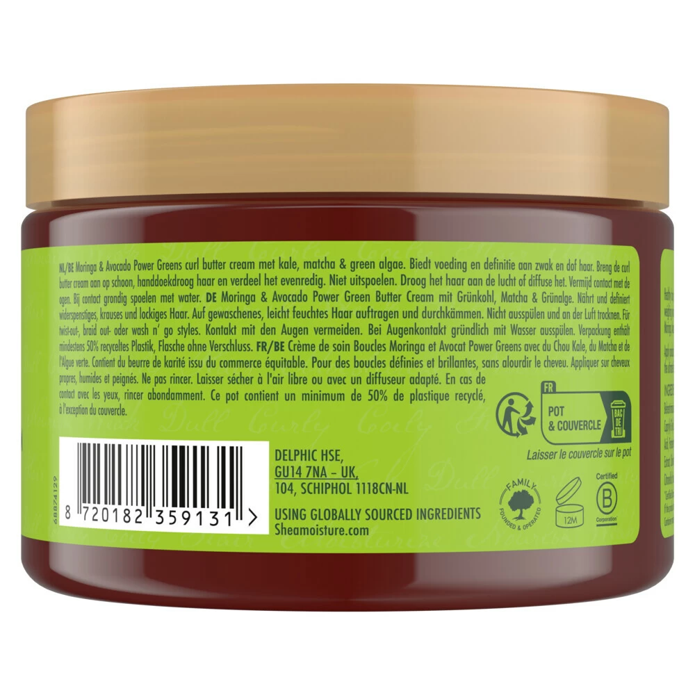 SheaMoisture Moringa & Avocado Power Greens Curl Butter Cream HaarcrèmeSheaMoisture Moringa & Avocado Power Greens Curl Butter Cream Haarcrème, verrijkt met sheaboter, boerenkool, groene algen en matcha, helpt om je krullen te hydrateren en te definiëren.SheaMoisture Moringa & Avocado Power Greens Curl Butter Cream HaarcrèmeHaarcrème verrijkt met moringa, avocado, boerenkool, groene algen en matchaHelpt om je krullen te hydrateren en te definiëre
